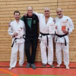 Die letzte Einheit übernahm Albert Wunder (3. Dan) mit dem Thema Selbstverteidigung. Wichtig sind vor allem das rechtzeitige Erkennen einer gefährlichen Situation und die Vermeidung einer Auseinandersetzung. Albert versuchte uns Lösungen an die Hand zu geben erklärte aber auch, dass das manchmal sehr schwierig ist, z.B. bei einem Messerangriff. Da ist es sehr unwahrscheinlich, dass man ohne Verletzungen davon kommt. Das konnten wir dann auch gleich partnerweise ausprobieren, indem uns der Partner mit einer kurzen Schaumstoffröhre als Messerersatz angriff. Das ist völlig ungefährlich und der Angreifer kann richtig angreifen, wodurch man eine sehr realistische Einschätzung von den eigenen Verteidigungsmöglichkeiten bekommt. Neben Angriffen mit einem Messer übten wir auch Kontaktangriffe wie Schwitzkasten und Würgen von vorne und hinten. FAZIT: Die Prävention ist das wichtigste Mittel bei der Selbstverteidigung, daher sollte man mit offenen Augen durchs Leben gehen. Gegen 16:00 endete ein sehr vielseitiger und abwechslungsreicher Lehrgang.